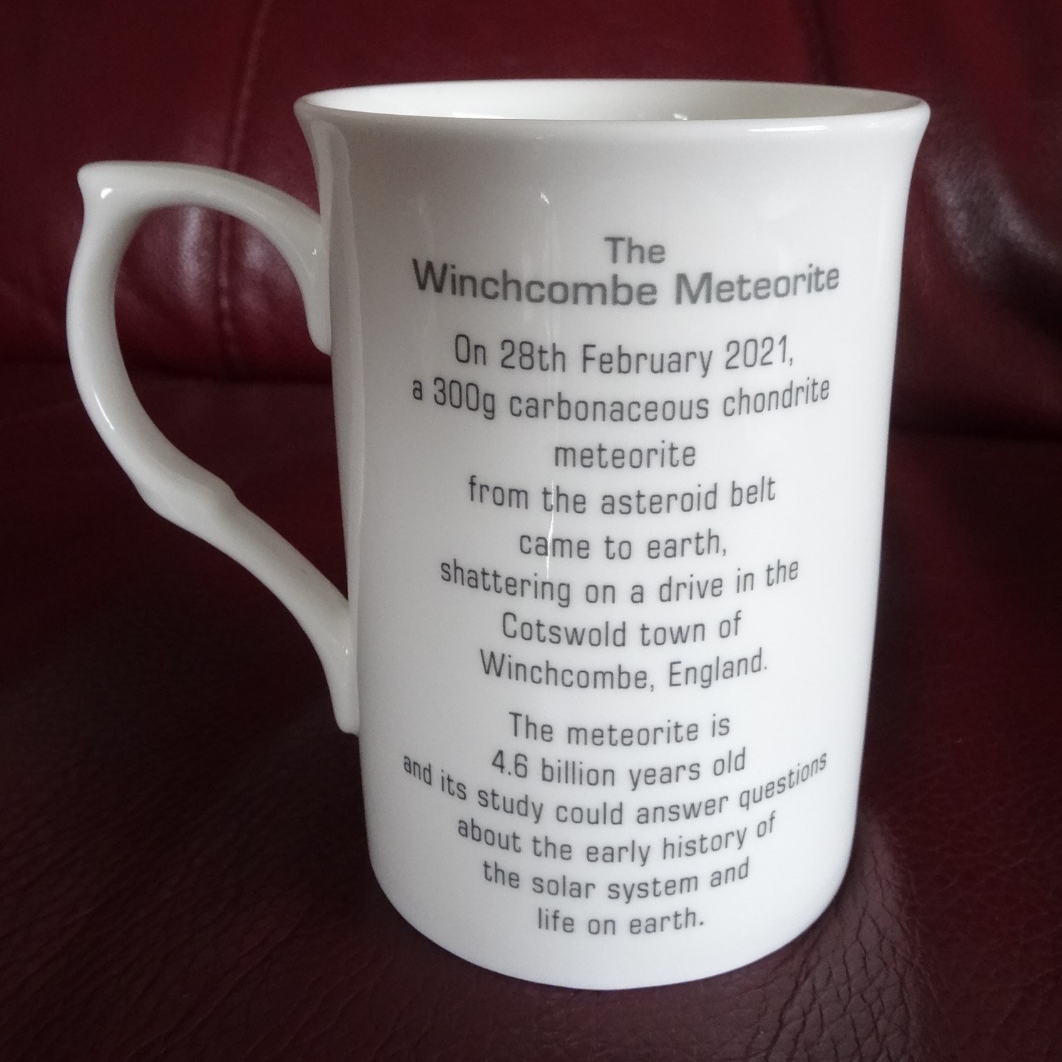 We have commissioned a special commemorative mug. Made from fine bone china, the mug has a unique photograph of the meteorite on the drive, taken less than 12 hours after it arrived on earth. The reverse side gives details about the meteorite itself. The mugs cost £10 and are available from the shop page.